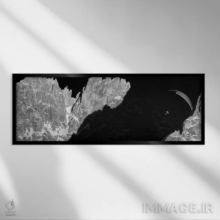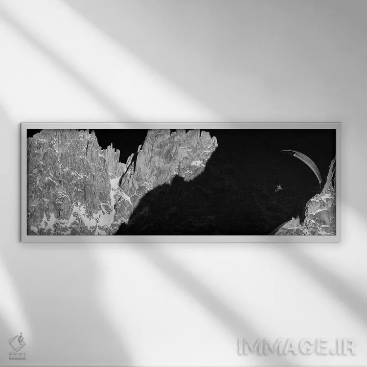 «پرواز غروب، ایگوئی دو گرپون، شامونی، اوت سووآ، اورنی—رون—آلپ، فرانسه» اثرِ «الکس بیوس» در فضای عکاسی سیاهوسفید، روی نور و کنتراست تکیه میکند؛ موضوعِ این اثر برای دکورهای مینیمال عالی است.