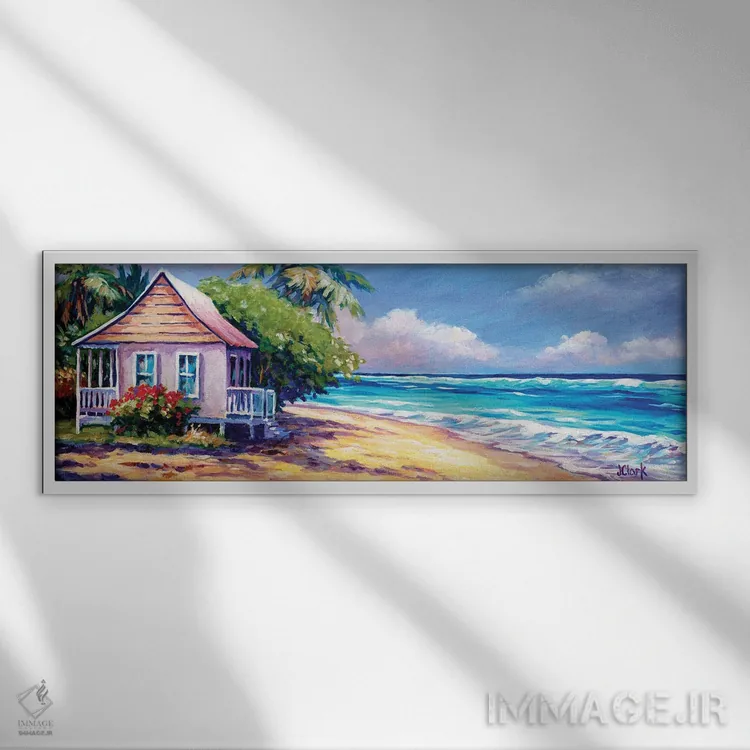 تابلو کلبه در ساحل اثر جان کلارک - نمای قاب‌دار سفید