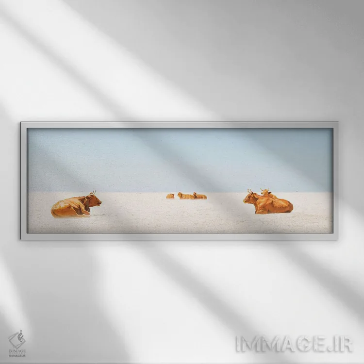 این اثر با عنوان «گاوهای آفتابگیر» اثرِ «اندرو لِوِر» فضا را صمیمیتر و دعوتکنندهتر نشان میدهد؛ برای اتاق کودک (بدون لحن کودکانه) انتخابی خوشسلیقه است. هم فضا را گرم میکند، هم شلوغش نمیکند.