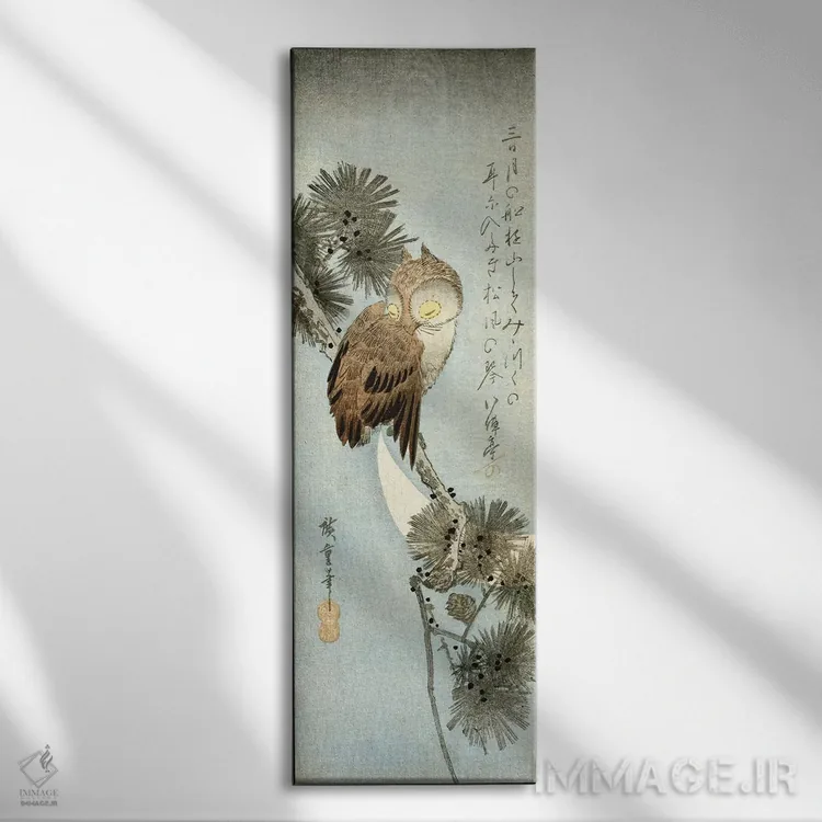 «ماه هلال و جغدی نشسته بر شاخههای کاج» اثرِ «اوتاگاوا هیروشگه (نقاش و چاپگر ژاپنی اوکییو—ئه)» یک انتخاب کلاسیک و مرتب است؛ موضوعِ این اثر در آن برای دکورهای لوکس و چوبی عالی مینشیند.