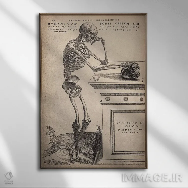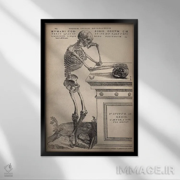 تابلو اسکلت ایستاده از اثر "ساختار بدن انسان" اثر وسالیوس (آندریاس وسالیوس - هنرمند و آناتومیست) - نمای پرسپکتیو محصول