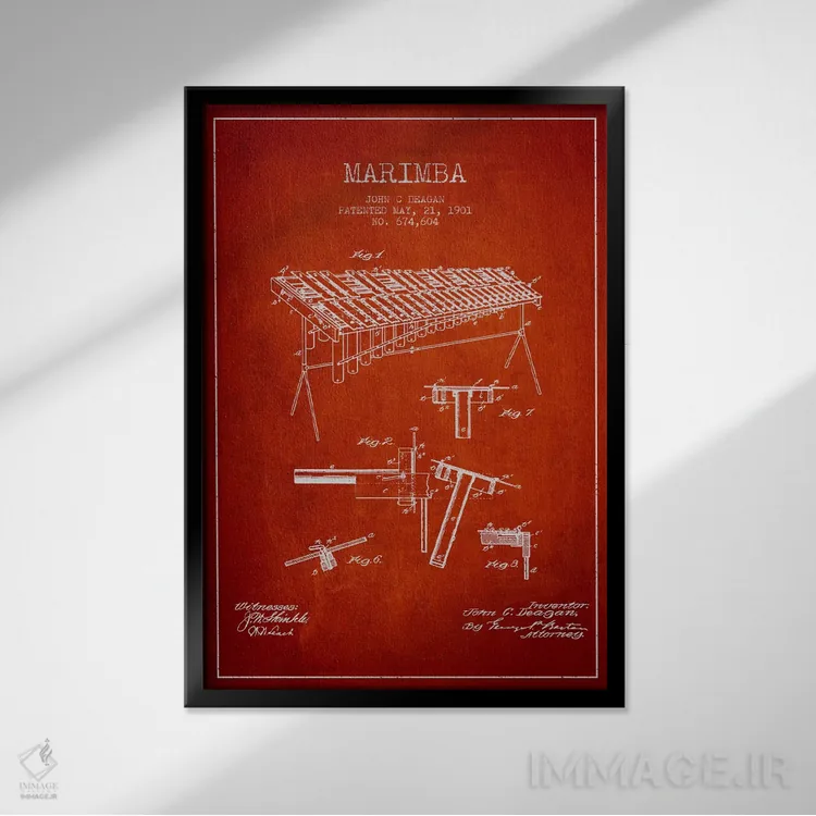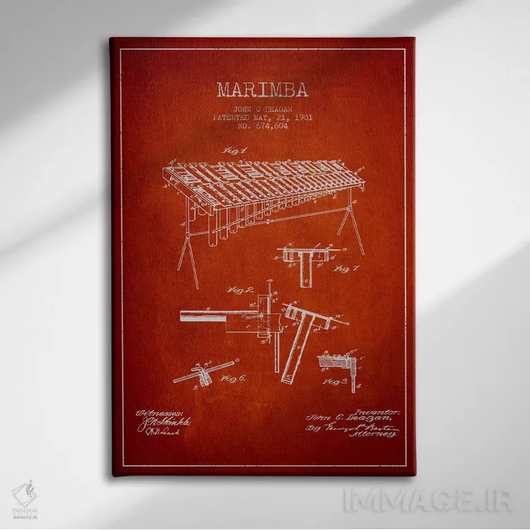 تابلو دکوراتیوِ «نقشهٔ پتنت ماریمبا (قرمز)»؛ مناسب برای فضاهایی با چوب تیره، چراغهای گرم و اکسسوریهای کلاسیک اثرِ «پیکسل کهنه (استودیو/نام هنری)».