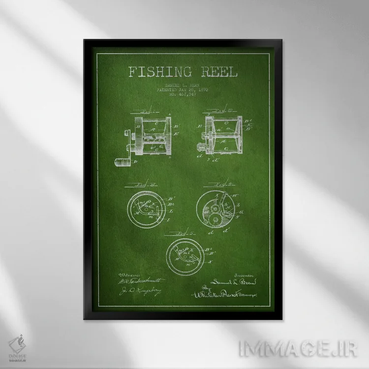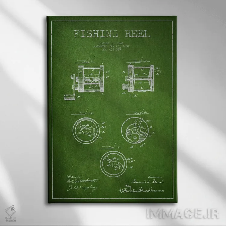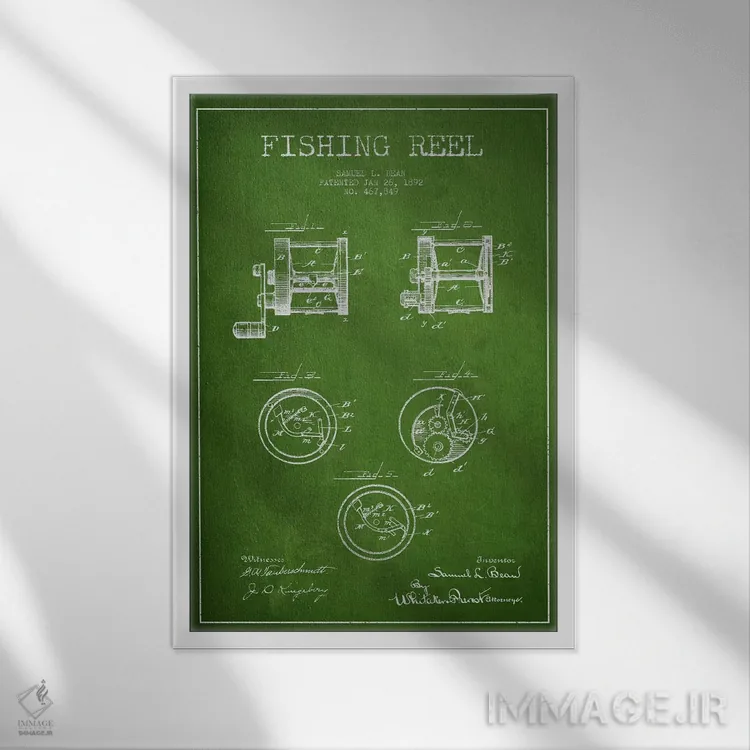 تابلو نقشهٔ حق‌امتیاز قرقره ماهیگیری سبز اثر پیکسل کهنه (استودیو/نام هنری) - نمای قاب‌دار سفید