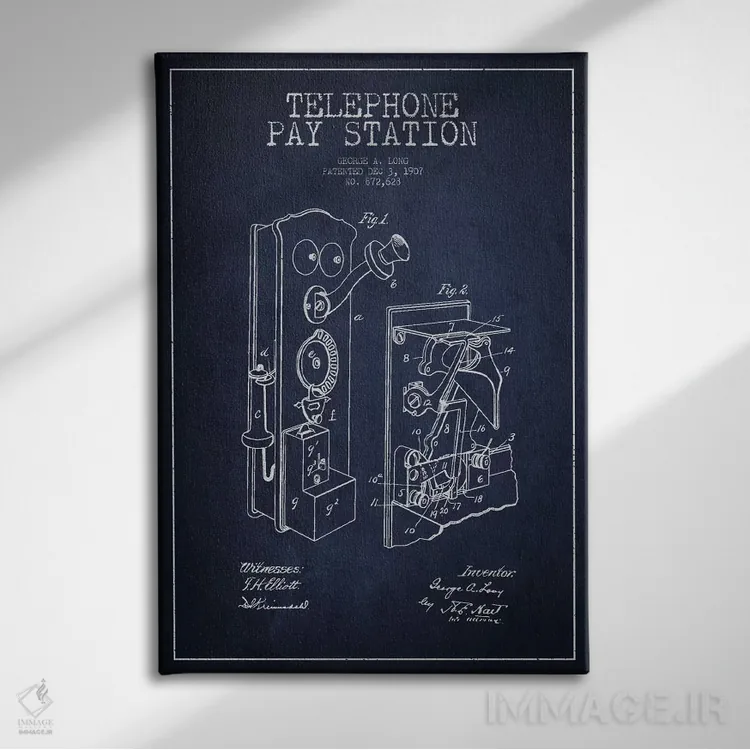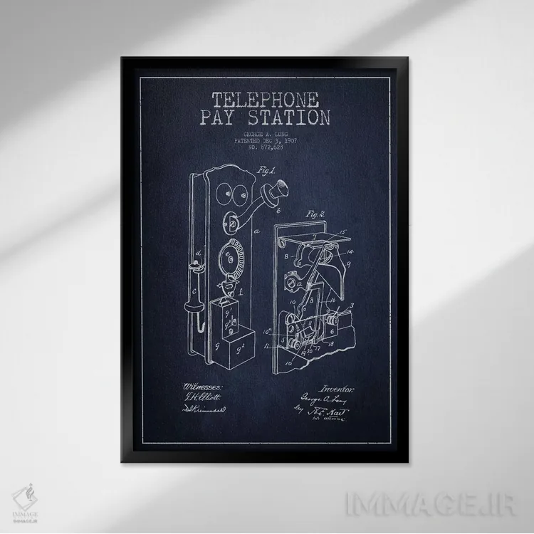 «نقشهٔ ثبت اختراع تلفن بلند (آبی)» اثرِ «پیکسل کهنه (استودیو/نام هنری)» با حالوهوای هنری، حس نوستالژی را شیک و دکورپذیر به فضا اضافه میکند.