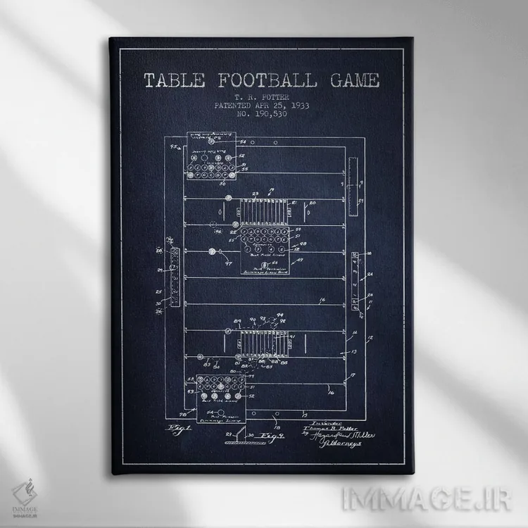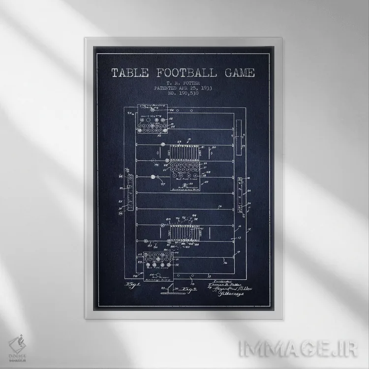 «نقشهٔ ثبت اختراع فوتبال رومیزی آبی نفتی» اثرِ «پیکسل کهنه (استودیو/نام هنری)» برای فضاهای گرم و صمیمی مناسب است؛ بهخصوص کنار چوب تیره و نور زرد.
