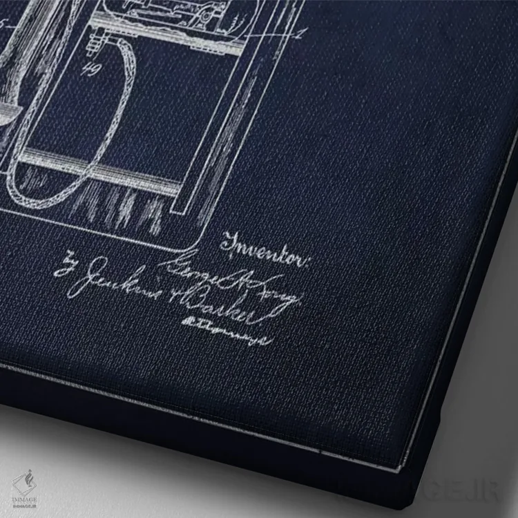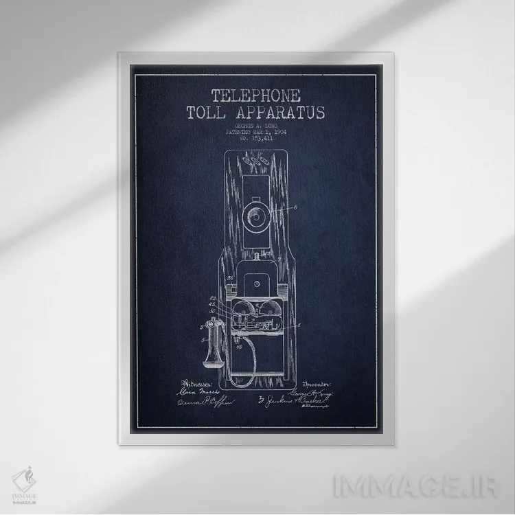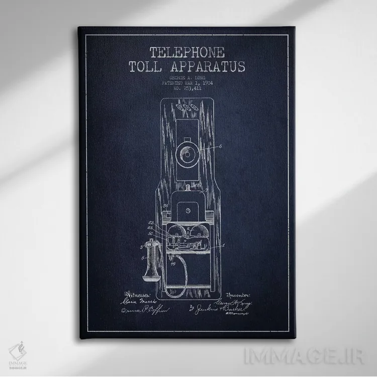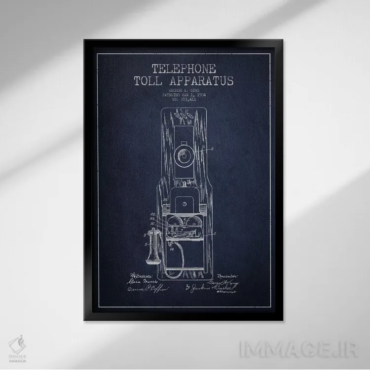 «نقشهٔ ثبت اختراع تلفن بینالمللی بلند (آبی)» اثرِ «پیکسل کهنه (استودیو/نام هنری)» اگر به جزئیات کلاسیک و حس قدیمیِ شیک علاقه دارید، گزینهی خوبیست.