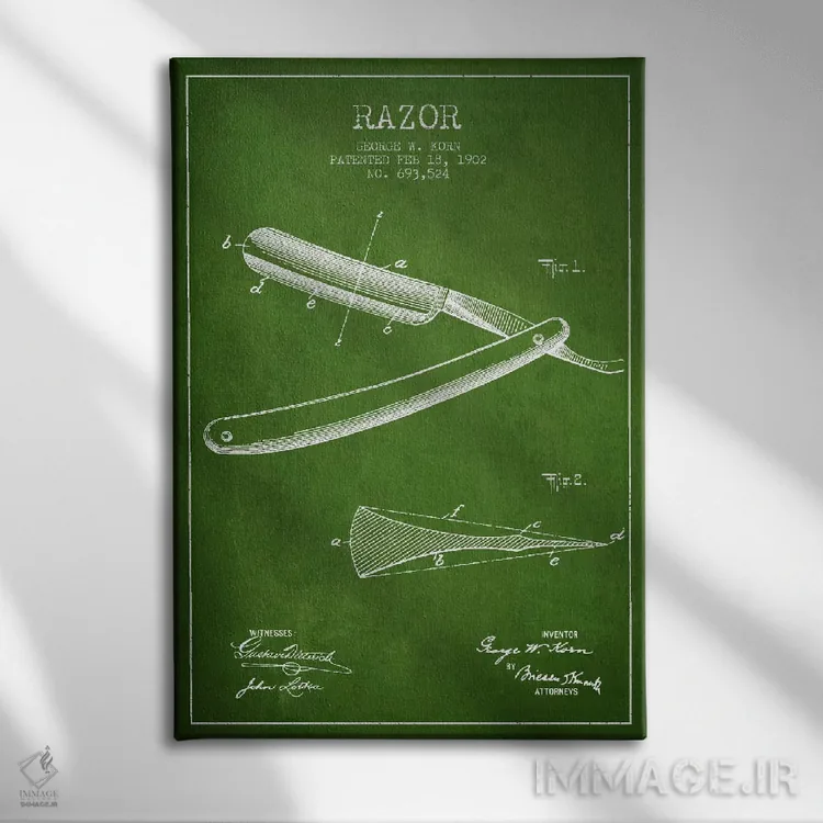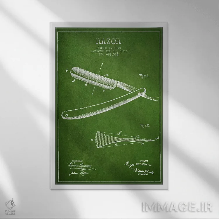 «نقشه ثبت اختراع ریشتراش (سبز)» اثرِ «پیکسل کهنه (استودیو/نام هنری)» با حالوهوای هنری، حس نوستالژیِ کنترلشدهای به فضا میدهد؛ مناسب برای چیدمانهای رترو و کلاسیک.