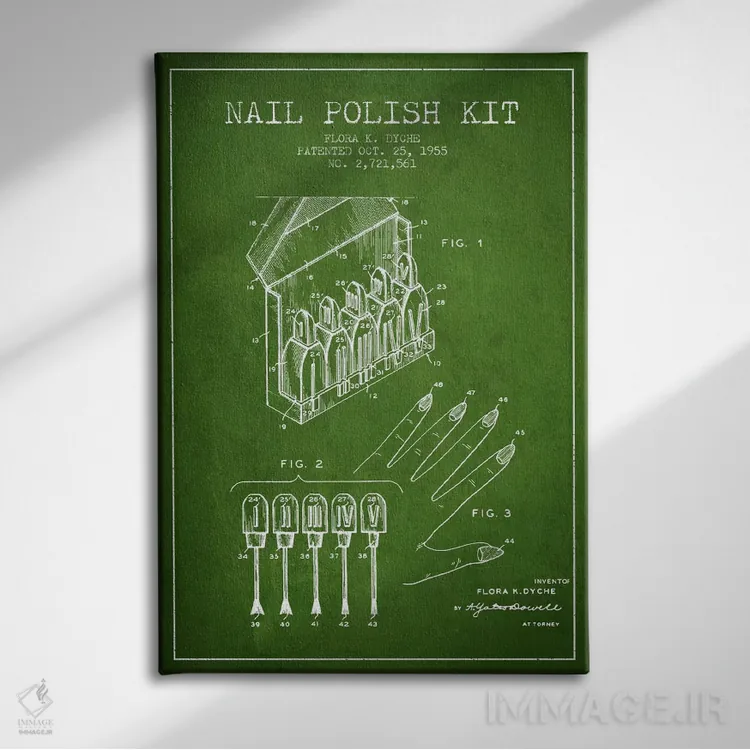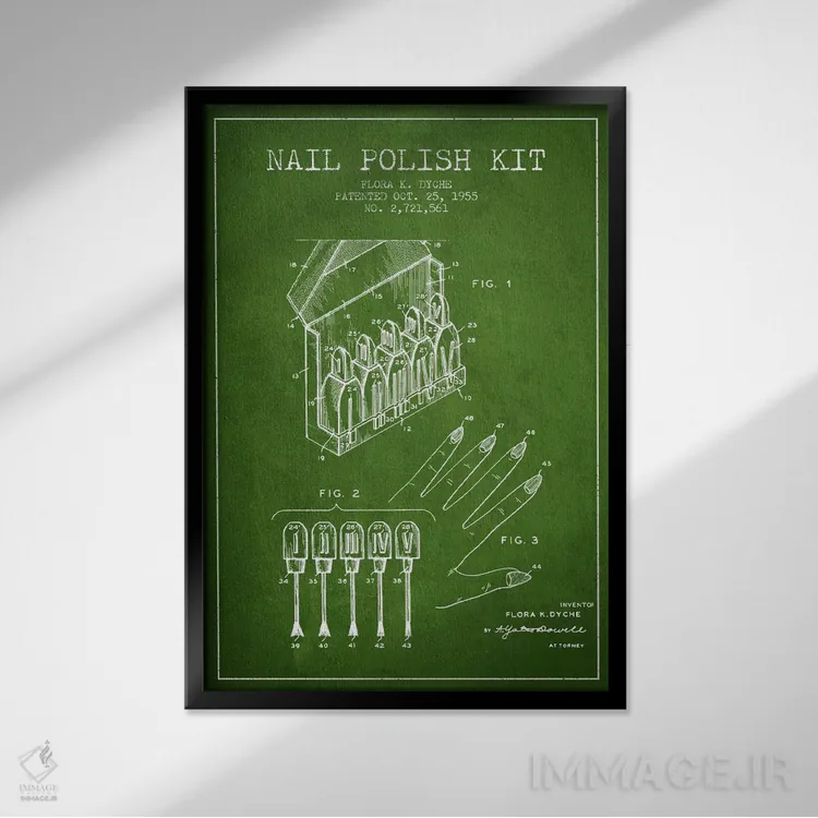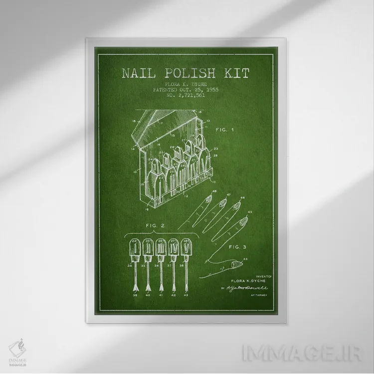 «نقشهٔ ثبت اختراع کیت لاک ناخن (سبز)» اثرِ «پیکسل کهنه (استودیو/نام هنری)» اگر به جزئیات کلاسیک و حس قدیمیِ شیک علاقه دارید، گزینهی خوبیست.