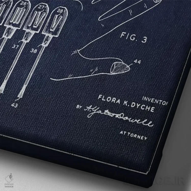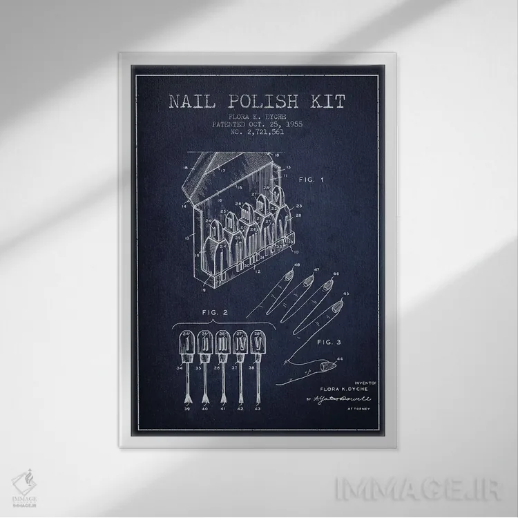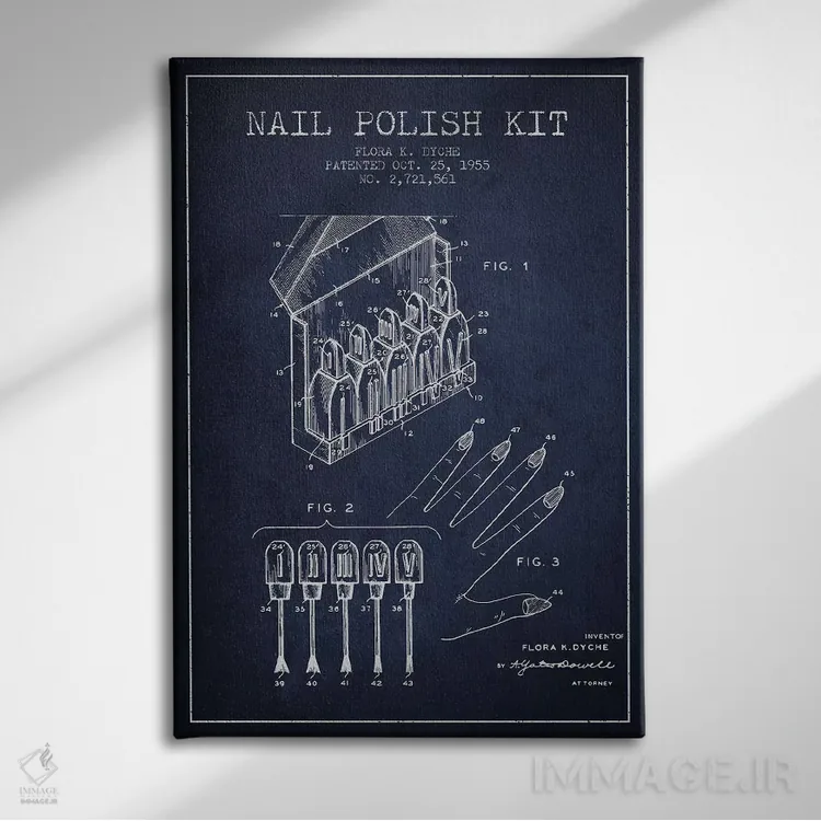 تابلو دکوراتیوِ «نقشهٔ ثبت اختراع کیت لاک ناخن (سرمهای)»؛ مناسب برای فضاهایی با چوب تیره، چراغهای گرم و اکسسوریهای کلاسیک اثرِ «پیکسل کهنه (استودیو/نام هنری)».