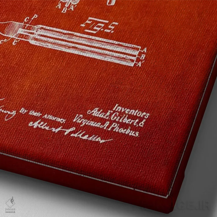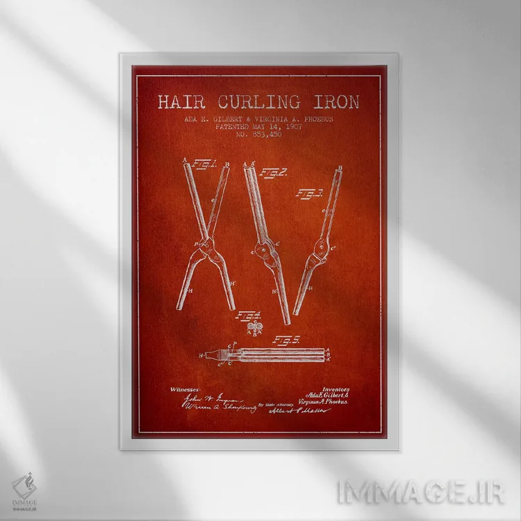 در «نقشهٔ ثبت اختراع فرکنندهٔ مو (قرمز)» اثرِ «پیکسل کهنه (استودیو/نام هنری)»، رنگها و فرمها یادآور پوسترهای قدیمیاند؛ انتخابی جذاب برای کافهاستایل و دکورهای شهری.