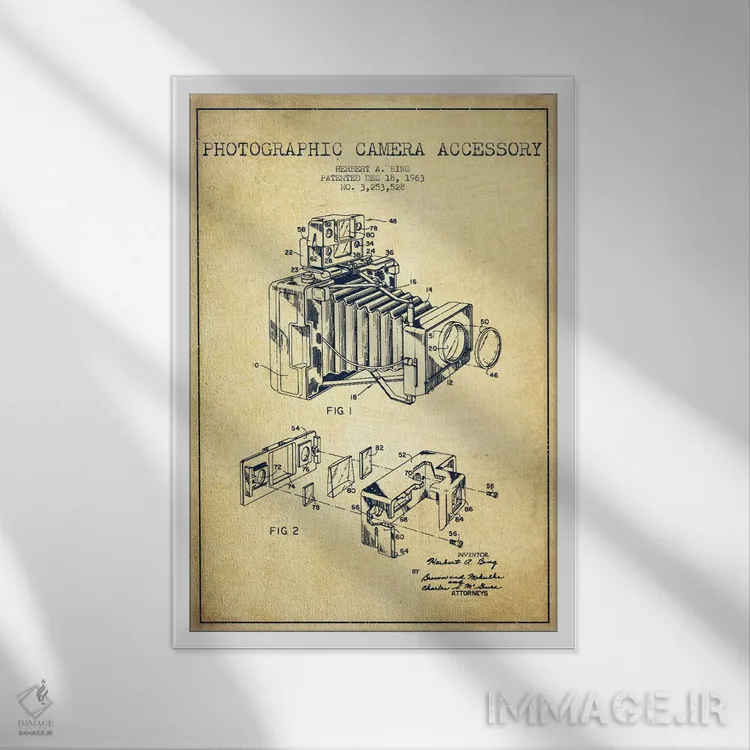 «نقشهٔ ثبت اختراع دوربین (طرح وینتیج)» اثرِ «پیکسل کهنه (استودیو/نام هنری)» با حالوهوای هنری، حس نوستالژیِ کنترلشدهای به فضا میدهد؛ مناسب برای چیدمانهای رترو و کلاسیک.