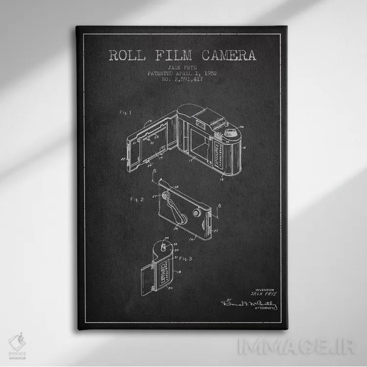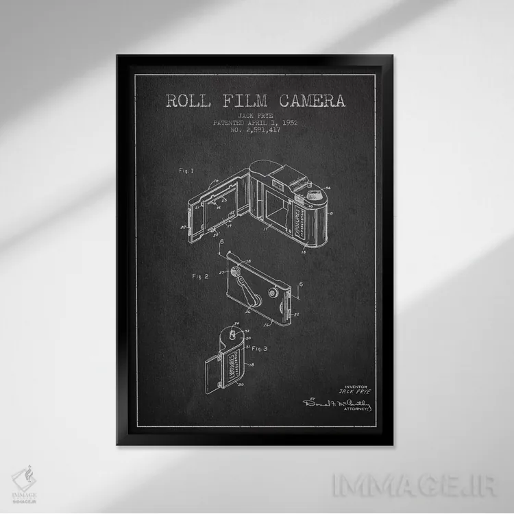 «نقشهٔ اختراع دوربین (ذغالی)» اثرِ «پیکسل کهنه (استودیو/نام هنری)» اگر به جزئیات کلاسیک و حس قدیمیِ شیک علاقه دارید، گزینهی خوبیست.