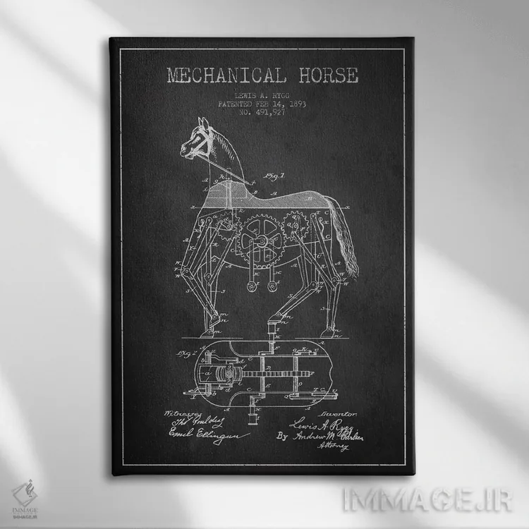 تابلو نقشهٔ اختراع اسب مکانیکی (تیره) اثر پیکسل کهنه (استودیو/نام هنری)