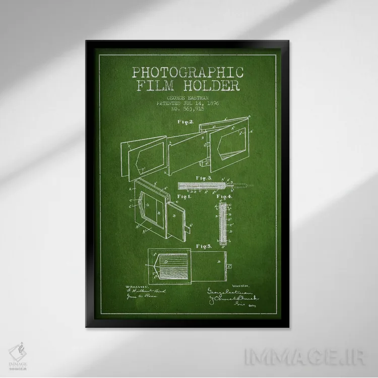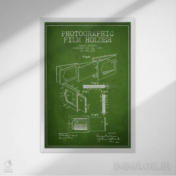 «نقشهٔ اختراع نگهدارنده فیلم (سبز)» اثرِ «پیکسل کهنه (استودیو/نام هنری)» با حالوهوای هنری، حس نوستالژیِ کنترلشدهای به فضا میدهد؛ مناسب برای چیدمانهای رترو و کلاسیک.