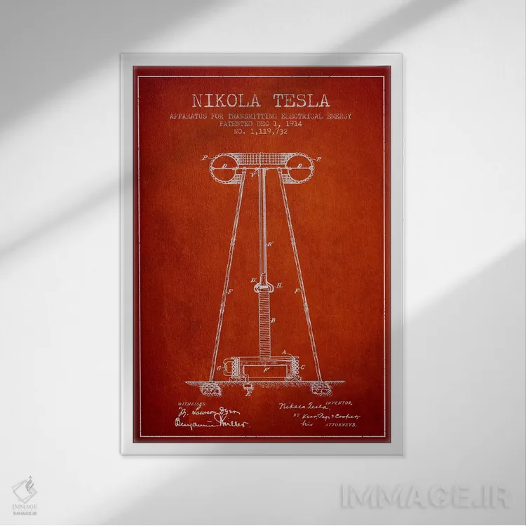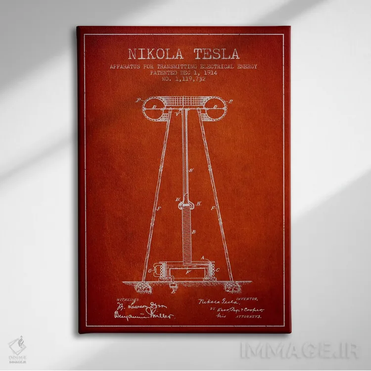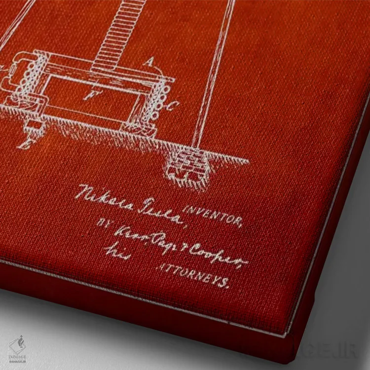 «نقشهٔ اختراع دستگاه انرژی تسلا (قرمز)» اثرِ «پیکسل کهنه (استودیو/نام هنری)» برای راهرو، ورودی یا دیوارهای کوچک هم گزینهی خوبیست؛ چون حسش فوری منتقل میشود.