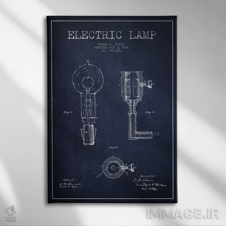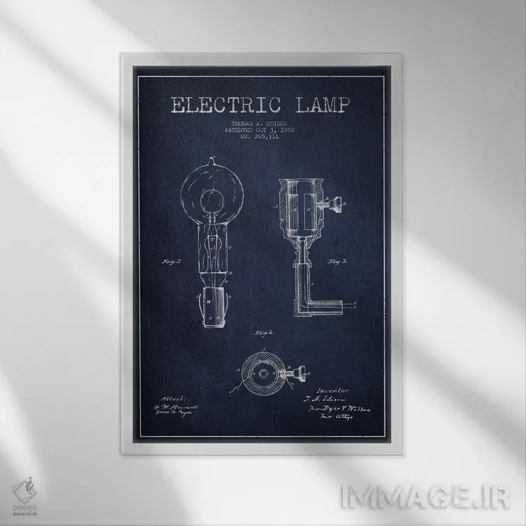 «نقشهٔ اختراع چراغ برقی (سرمهای)» اثرِ «پیکسل کهنه (استودیو/نام هنری)» با حالوهوای هنری، حس نوستالژی را شیک و دکورپذیر به فضا اضافه میکند.