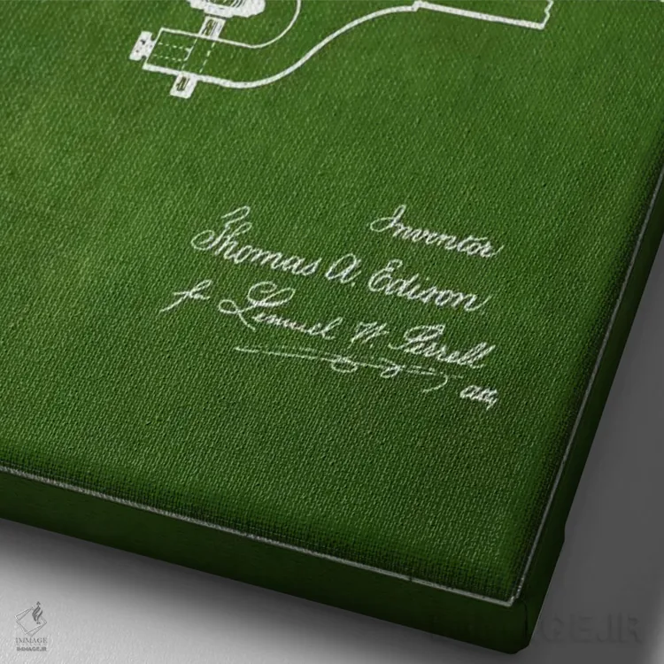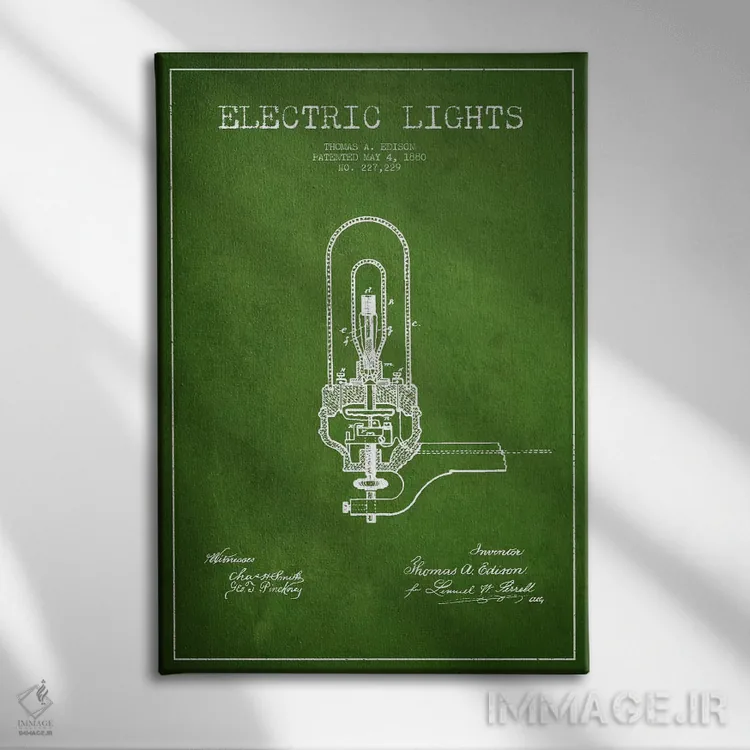 تابلو دکوراتیوِ «نقشهٔ اختراع چراغهای برقی (سبز)»؛ مناسب برای فضاهایی با چوب تیره، چراغهای گرم و اکسسوریهای کلاسیک اثرِ «پیکسل کهنه (استودیو/نام هنری)».