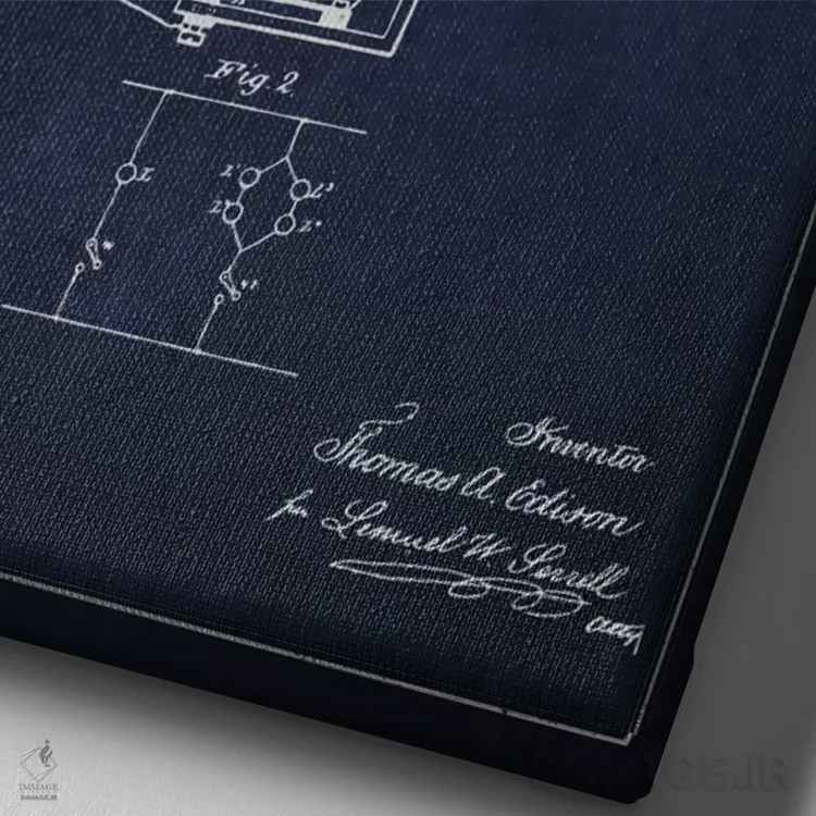تابلو دکوراتیوِ «نقشهٔ اختراع چراغ الکتریکی (سرمهای)»؛ مناسب برای فضاهایی با چوب تیره، چراغهای گرم و اکسسوریهای کلاسیک اثرِ «پیکسل کهنه (استودیو/نام هنری)».