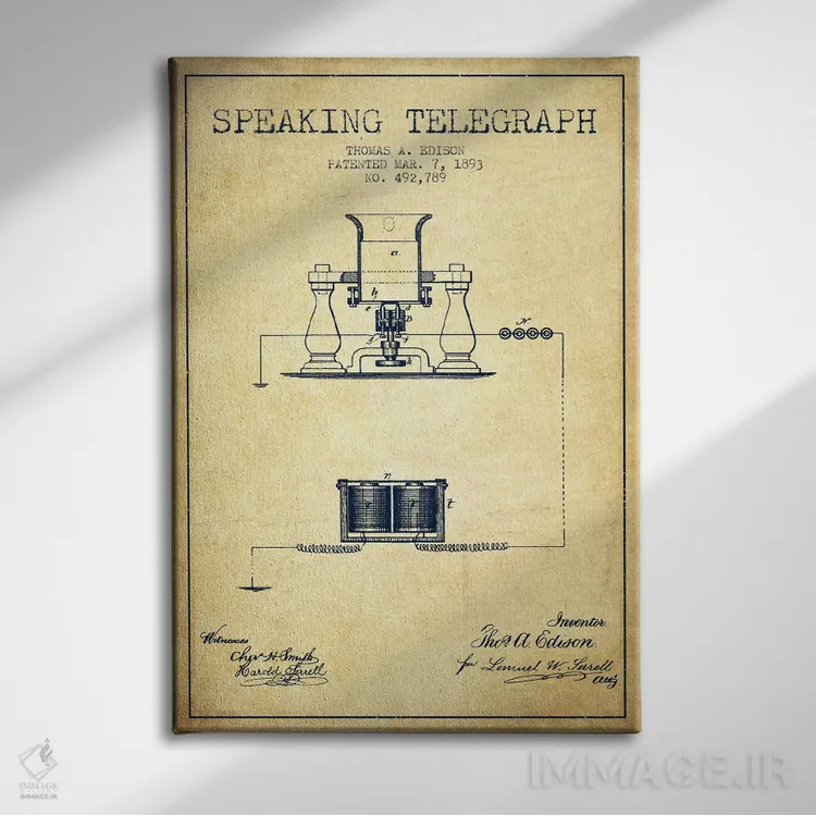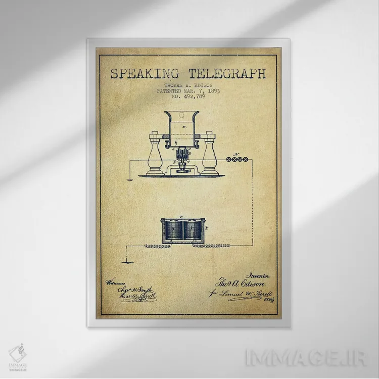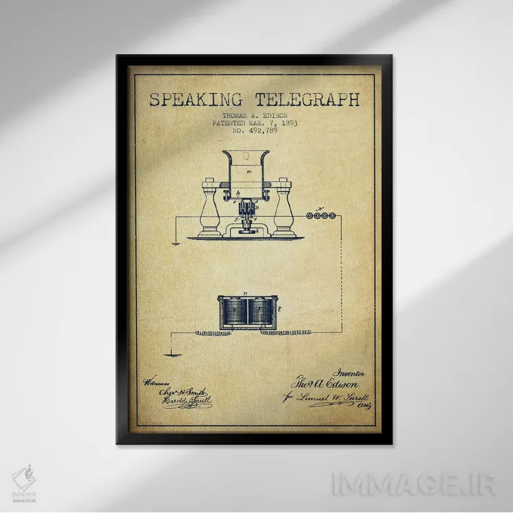 «طرح ثبت اختراع تلفن سخنگو (قدیمی)» اثرِ «پیکسل کهنه (استودیو/نام هنری)» با حالوهوای هنری، حس نوستالژیِ کنترلشدهای به فضا میدهد؛ مناسب برای چیدمانهای رترو و کلاسیک.