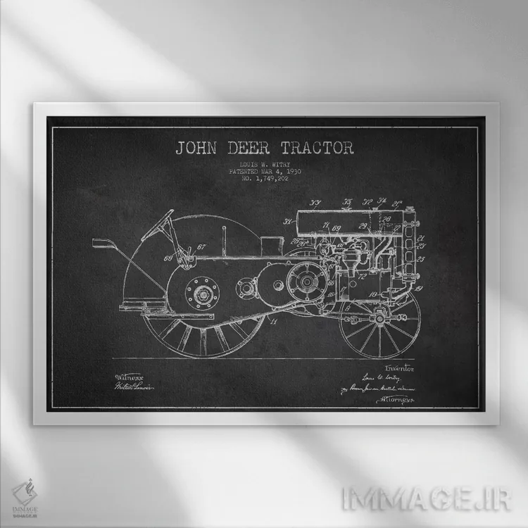 «طرح ثبت اختراع جان دیر ۳ (طرح ذغالی)» اثرِ «پیکسل کهنه (استودیو/نام هنری)» کنار پوسترها و قابهای ساده، یک ترکیب دلنشین و متعادل میسازد.