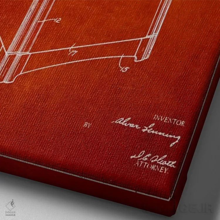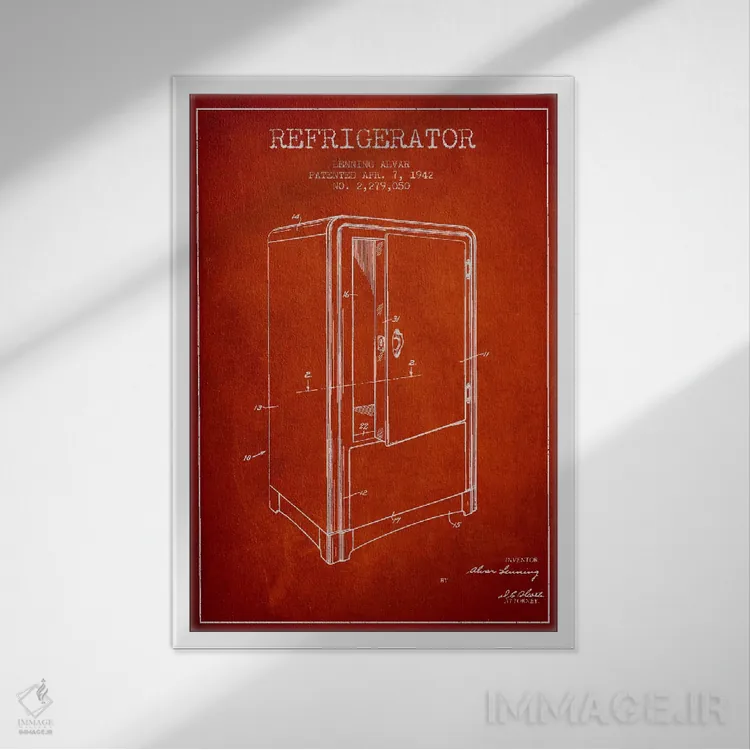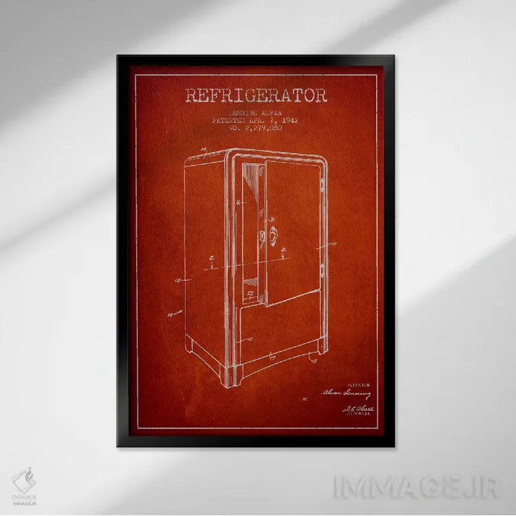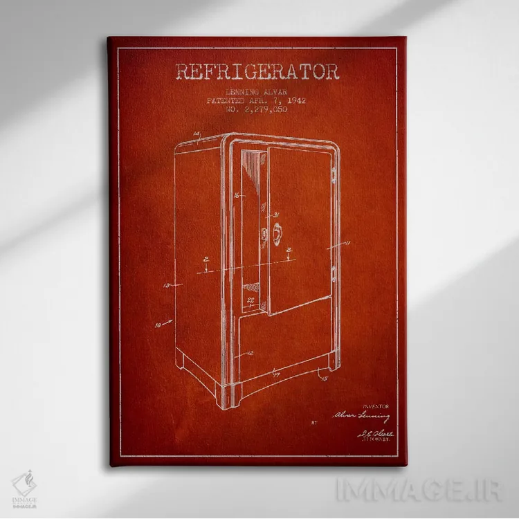 تابلو دکوراتیوِ «طرح ثبت اختراع یخچال (قرمز)»؛ مناسب برای فضاهایی با چوب تیره، چراغهای گرم و اکسسوریهای کلاسیک اثرِ «پیکسل کهنه (استودیو/نام هنری)».