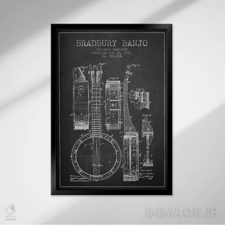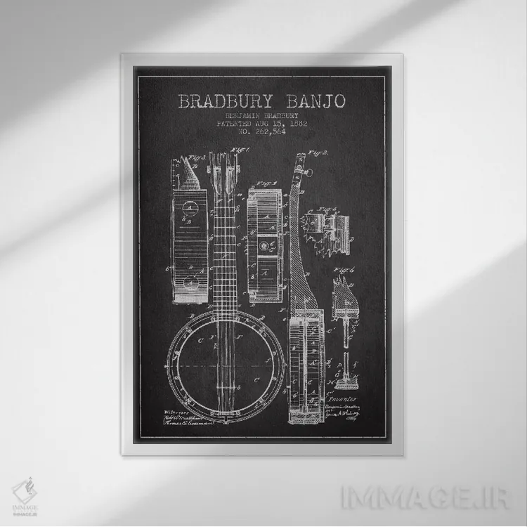 تابلو طرح ثبت اختراع بانجو (زغالی) اثر پیکسل کهنه (استودیو/نام هنری) - نمای قاب‌دار مشکی