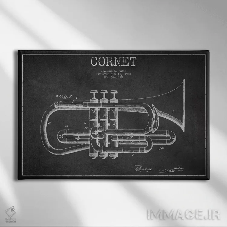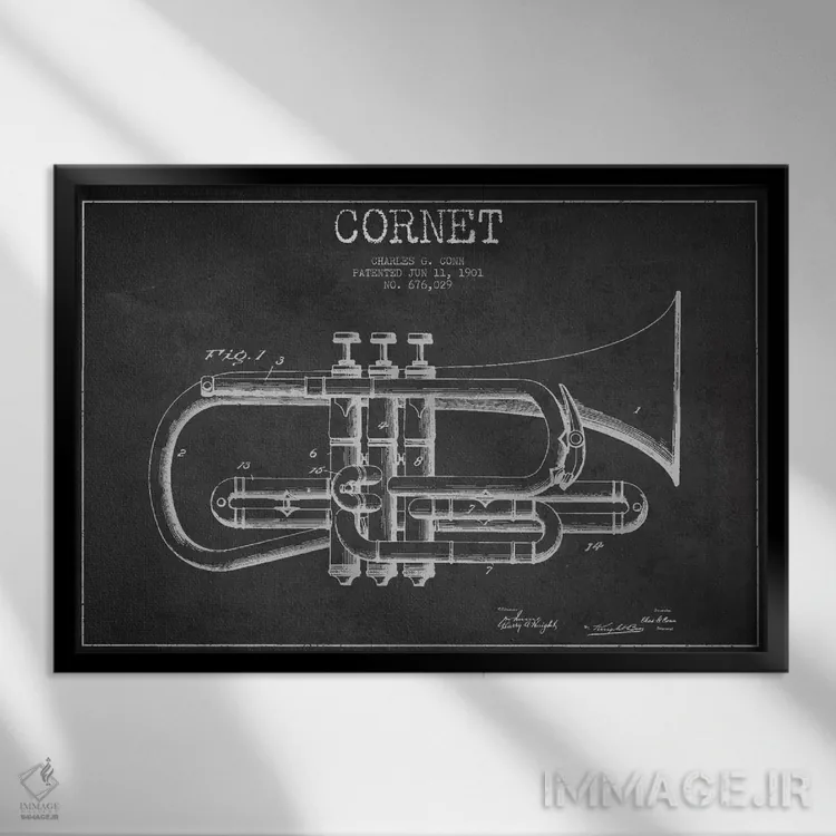 تابلو طرح ثبت اختراع کورنت (زغالی) (ساز بادی برنجی شبیه ترومپت) اثر پیکسل کهنه (استودیو/نام هنری)