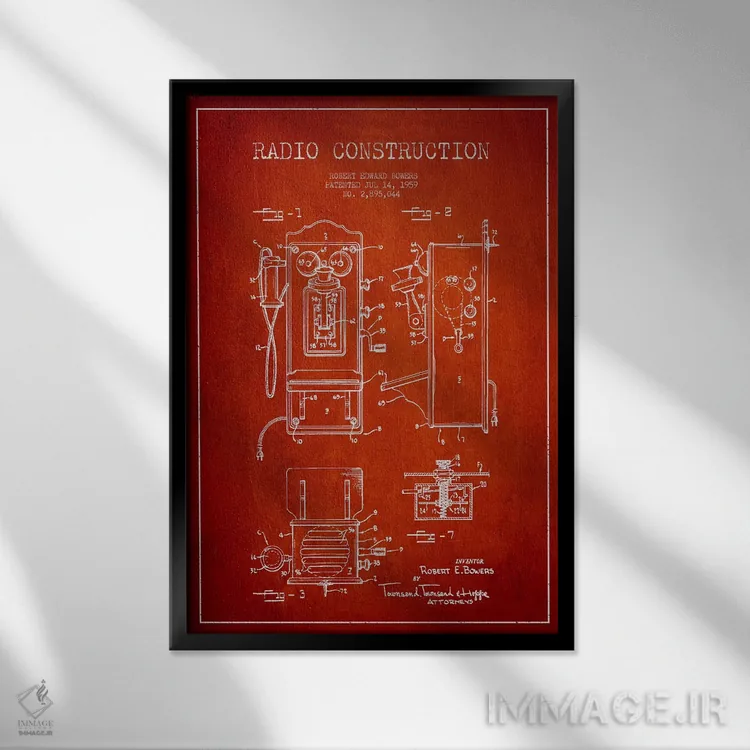 تابلو طرح ثبت اختراع رادیو بائرز (قرمز) اثر پیکسل کهنه (استودیو/نام هنری) - نمای قاب‌دار مشکی
