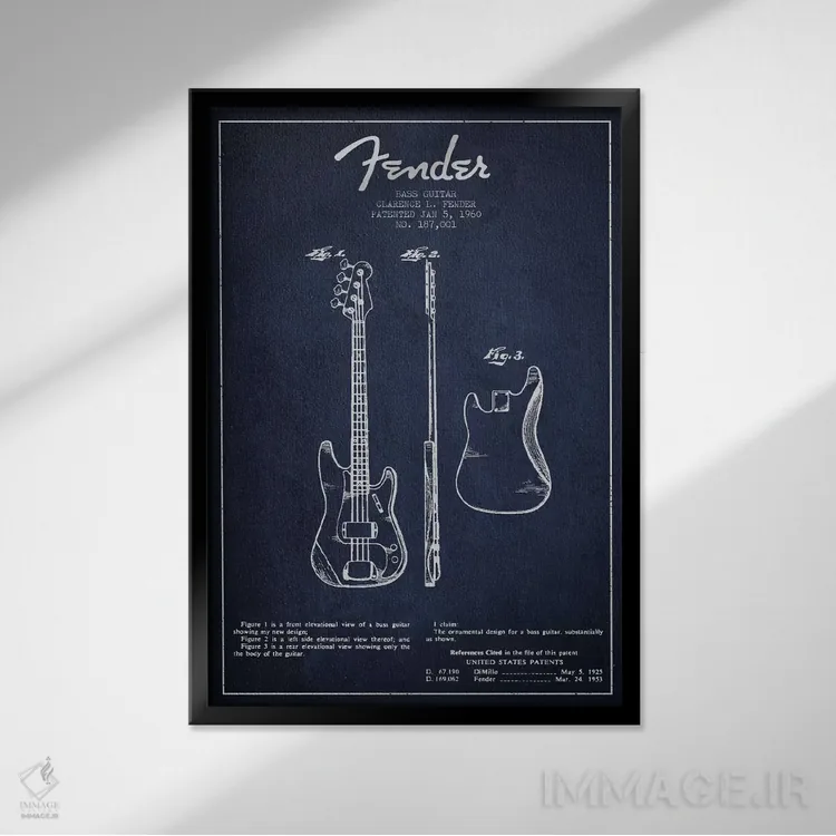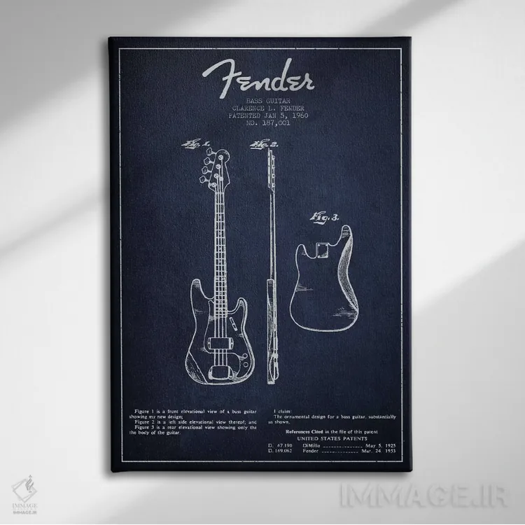 «طرح ثبت اختراع گیتار بیس (آبی نفتی)» اثرِ «پیکسل کهنه (استودیو/نام هنری)» با حالوهوای هنری، حس نوستالژی را شیک و دکورپذیر به فضا اضافه میکند.