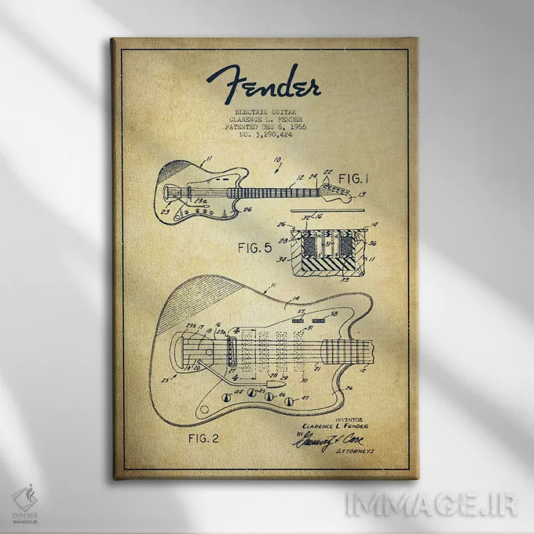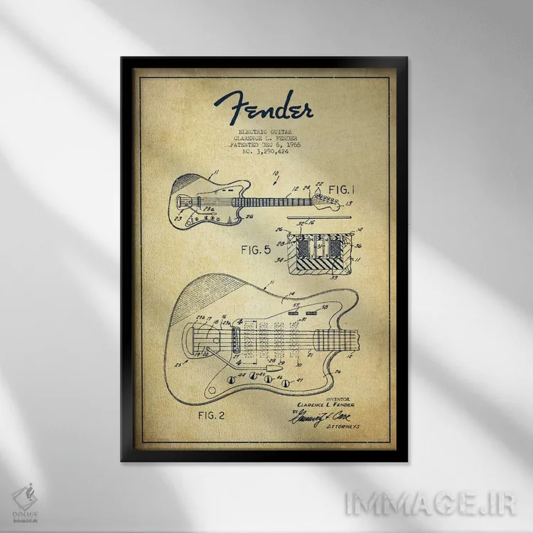 «طرح ثبت اختراع گیتار الکتریک (کهنه)» اثرِ «پیکسل کهنه (استودیو/نام هنری)» کنار پوسترها و قابهای ساده، یک ترکیب دلنشین و متعادل میسازد.