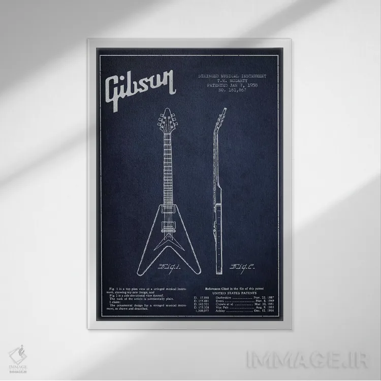 تابلو طرح ثبت اختراع گیتار الکتریک گیبسون (آبی نفتی) اثر پیکسل کهنه (استودیو/نام هنری) - نمای قاب‌دار مشکی