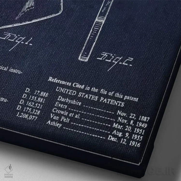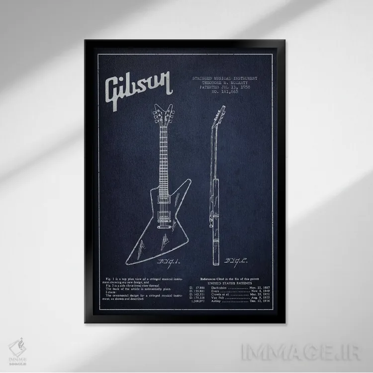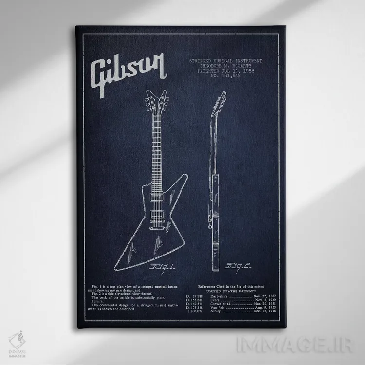 «نقشهٔ اختراعی گیتار برقی گیبسون (آبی نفتی)» اثرِ «پیکسل کهنه (استودیو/نام هنری)» با حالوهوای هنری، حس نوستالژی را شیک و دکورپذیر به فضا اضافه میکند.