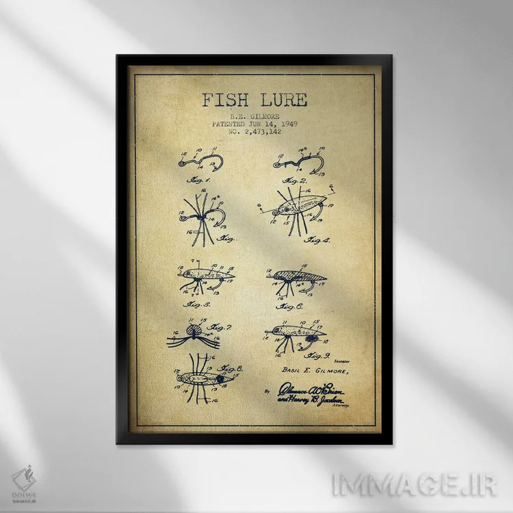 «نقشهٔ حقامتیاز طعمهٔ ماهیگیری کلاسیک» اثرِ «پیکسل کهنه (استودیو/نام هنری)» کنار پوسترها و قابهای ساده، یک ترکیب دلنشین و متعادل میسازد.
