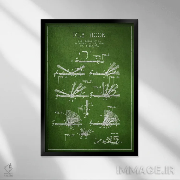 تابلو نقشهٔ حق‌امتیاز قلاب فلای (ماهیگیری) سبز اثر پیکسل کهنه (استودیو/نام هنری) - نمای قاب‌دار مشکی