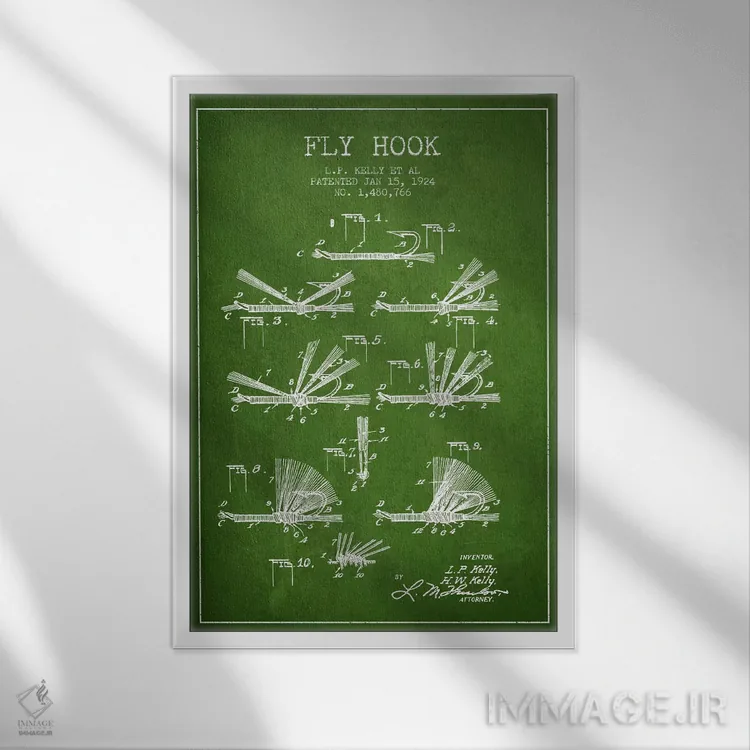 تابلو نقشهٔ حق‌امتیاز قلاب فلای (ماهیگیری) سبز اثر پیکسل کهنه (استودیو/نام هنری) - نمای قاب‌دار سفید