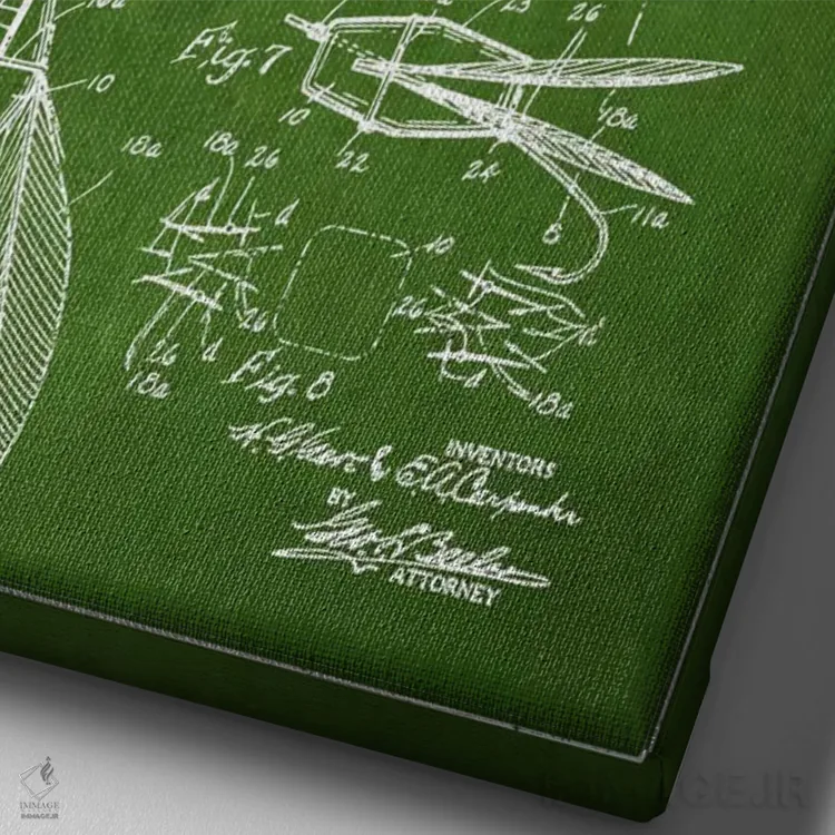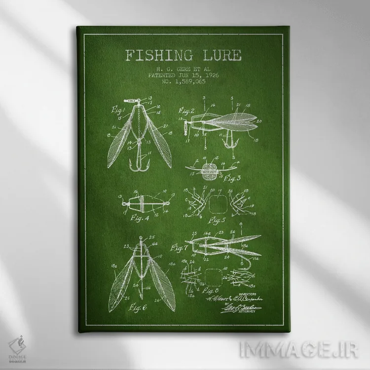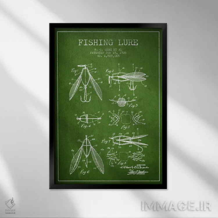 تابلو نقشهٔ حق‌امتیاز طعمهٔ مصنوعی ماهیگیری سبز اثر پیکسل کهنه (استودیو/نام هنری) - نمای قاب‌دار سفید