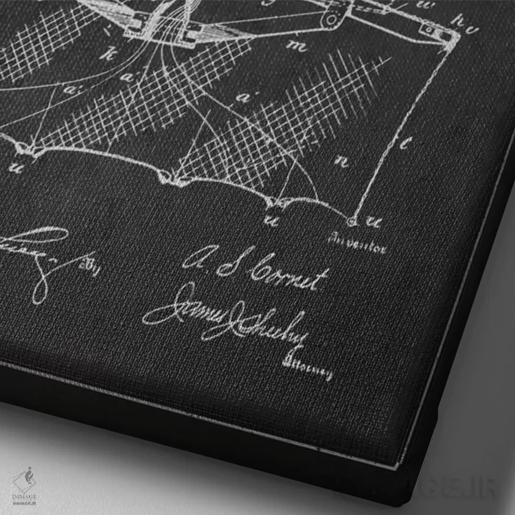 «نقشهٔ ثبت اختراع تور ماهیگیری ذغالی» اثرِ «پیکسل کهنه (استودیو/نام هنری)» با حالوهوای هنری، حس نوستالژی را شیک و دکورپذیر به فضا اضافه میکند.