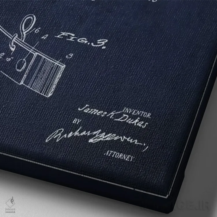 «نقشهٔ ثبت اختراع تور ماهیگیری سرمهای» اثرِ «پیکسل کهنه (استودیو/نام هنری)» با حالوهوای هنری، حس نوستالژی را شیک و دکورپذیر به فضا اضافه میکند.