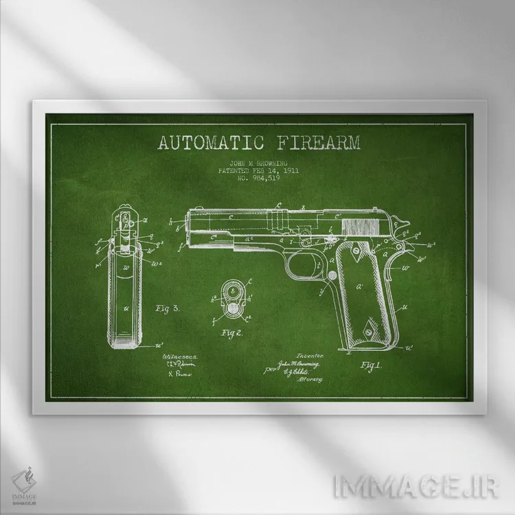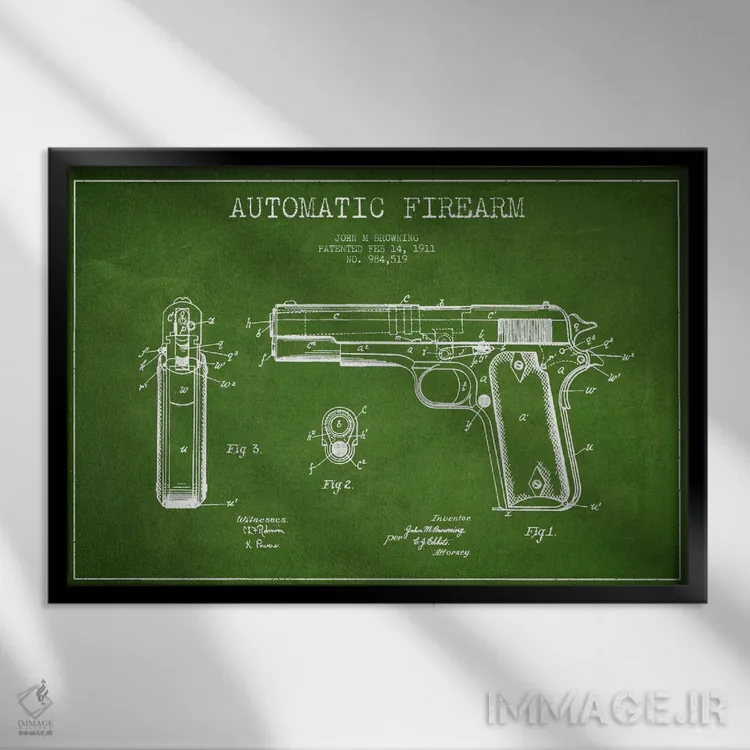 تابلو نقشهٔ ثبت اختراع سلاح خودکار سبز اثر پیکسل کهنه (استودیو/نام هنری)