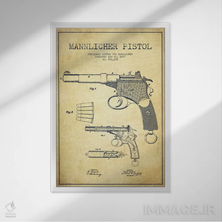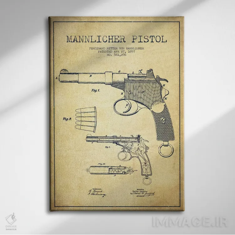 تابلو نقشهٔ ثبت اختراع تپانچه مانلیکر قدیمی اثر پیکسل کهنه (استودیو/نام هنری)