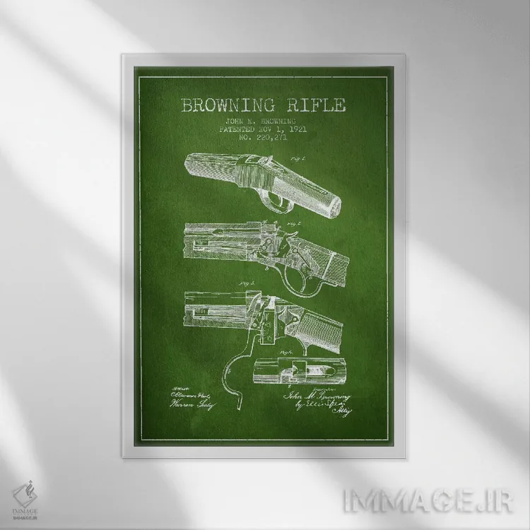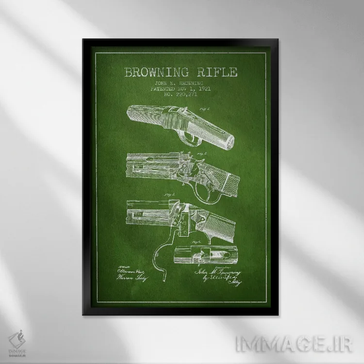 «نقشهٔ ثبت اختراع تفنگ برونینگ سبز» اثرِ «پیکسل کهنه (استودیو/نام هنری)» با حالوهوای هنری، حس نوستالژی را شیک و دکورپذیر به فضا اضافه میکند.