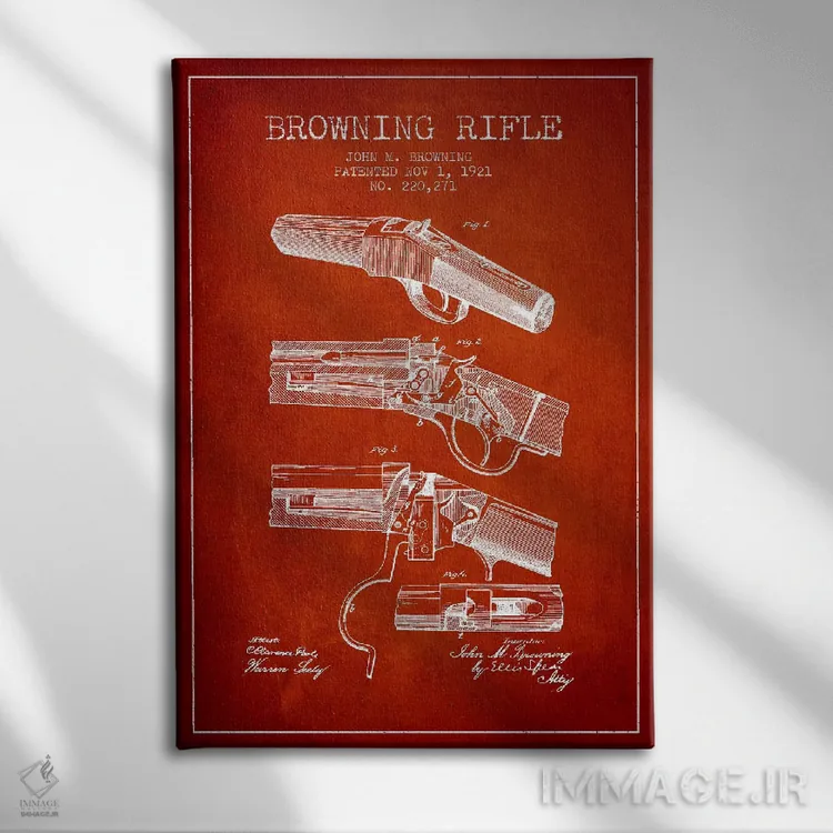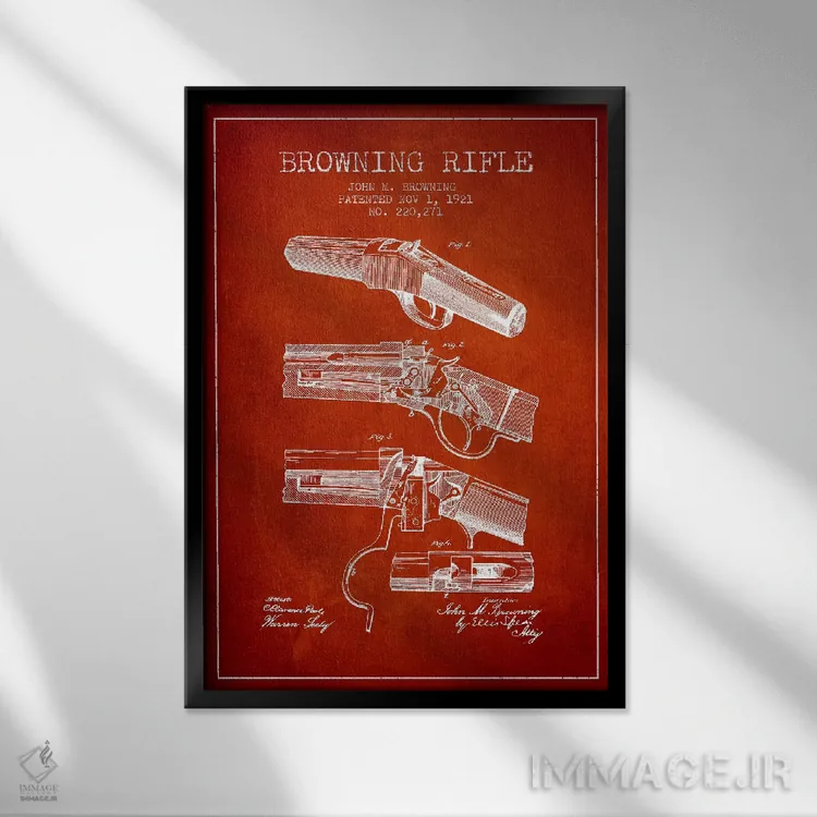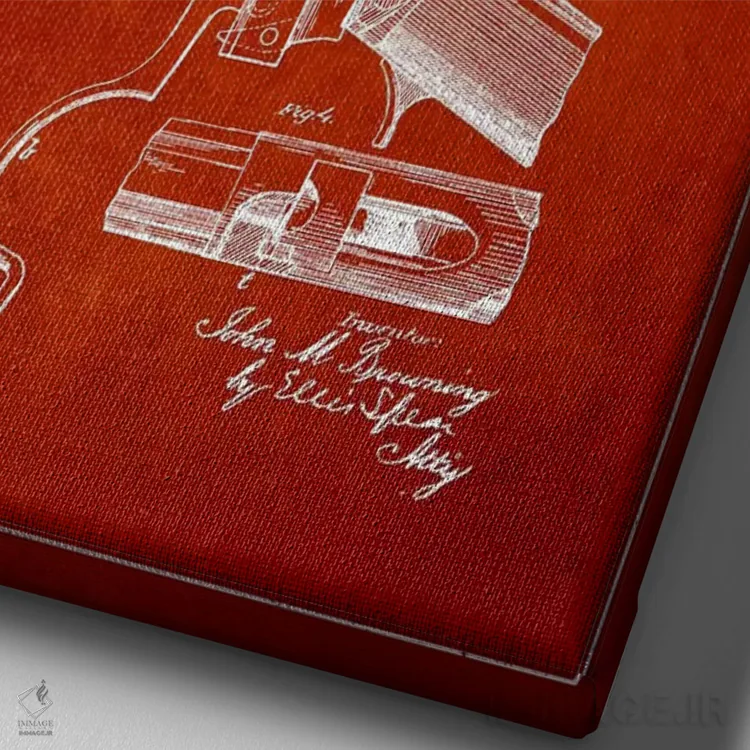 «نقشهٔ ثبت اختراع تفنگ برونینگ قرمز» اثرِ «پیکسل کهنه (استودیو/نام هنری)» برای فضاهای گرم و صمیمی مناسب است؛ بهخصوص کنار چوب تیره و نور زرد.