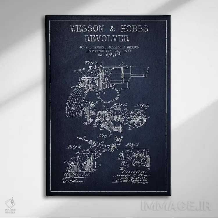 «نقشهٔ ثبت اختراع رولور وسن و هابز سرمهای» اثرِ «پیکسل کهنه (استودیو/نام هنری)» برای فضاهای گرم و صمیمی مناسب است؛ بهخصوص کنار چوب تیره و نور زرد.