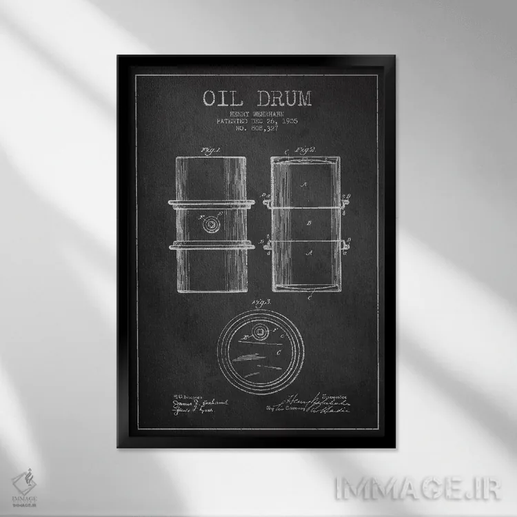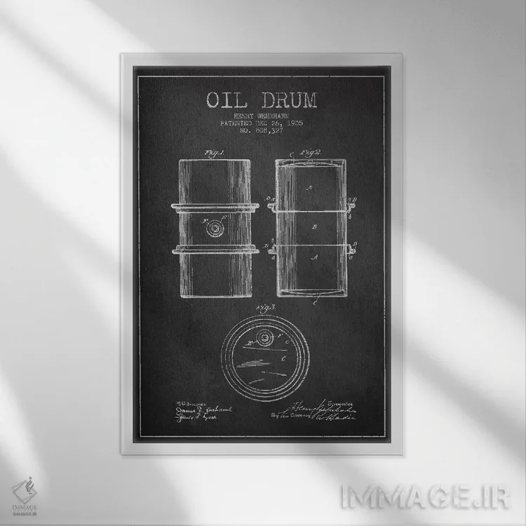 «نقشهٔ ثبت اختراع بشکه نفت ذغالی» اثرِ «پیکسل کهنه (استودیو/نام هنری)» با حالوهوای هنری، حس نوستالژیِ کنترلشدهای به فضا میدهد؛ مناسب برای چیدمانهای رترو و کلاسیک.