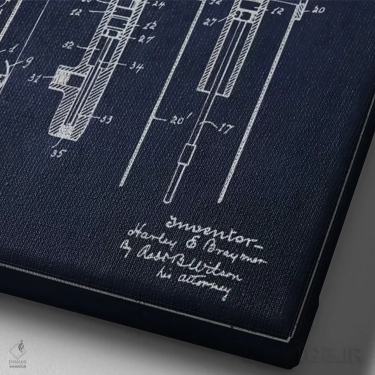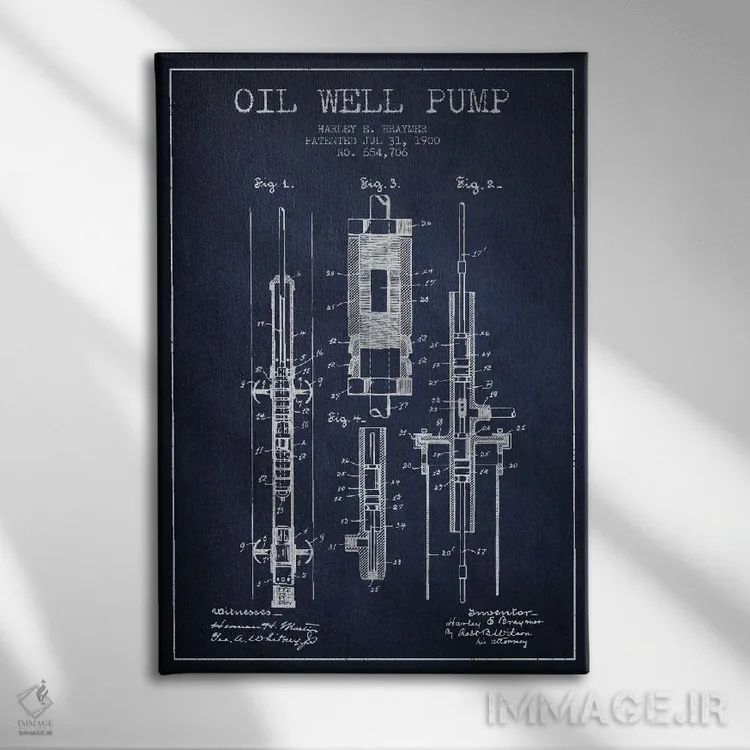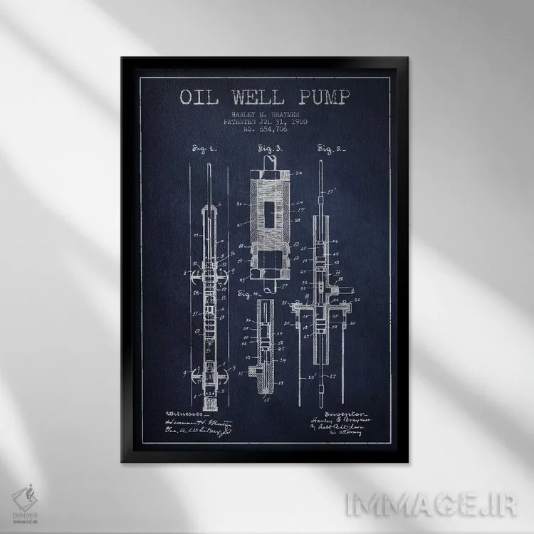 «نقشهٔ ثبت اختراع پمپ نفت سرمهای» اثرِ «پیکسل کهنه (استودیو/نام هنری)» با حالوهوای هنری، حس نوستالژیِ کنترلشدهای به فضا میدهد؛ مناسب برای چیدمانهای رترو و کلاسیک.