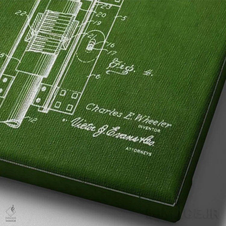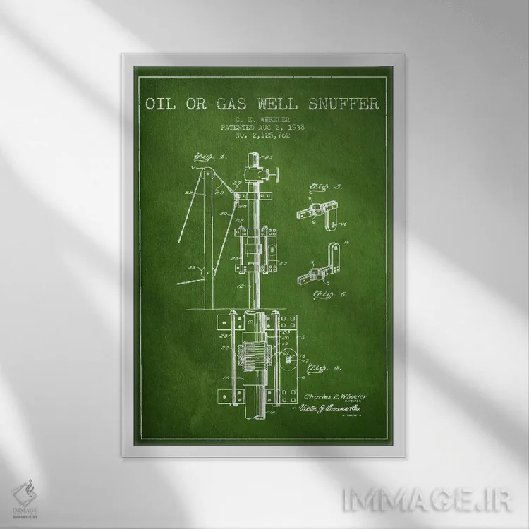 «نقشهٔ ثبت اختراع خاموشکن نفت و گاز (سبز)» اثرِ «پیکسل کهنه (استودیو/نام هنری)» با حالوهوای هنری، حس نوستالژیِ کنترلشدهای به فضا میدهد؛ مناسب برای چیدمانهای رترو و کلاسیک.