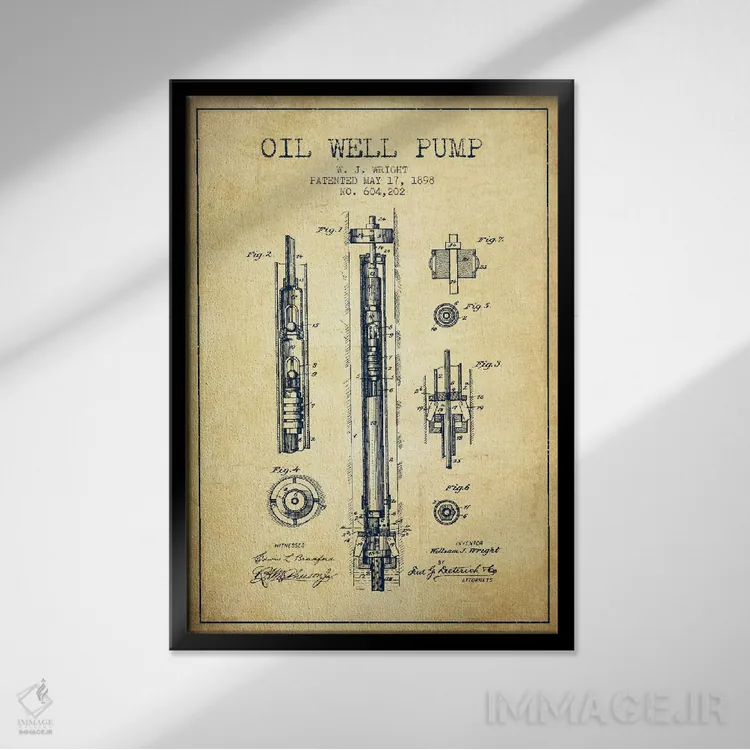 «نقشهٔ ثبت اختراع پمپ چاه نفت (طرح قدیمی)» اثرِ «پیکسل کهنه (استودیو/نام هنری)» کنار پوسترها و قابهای ساده، یک ترکیب دلنشین و متعادل میسازد.