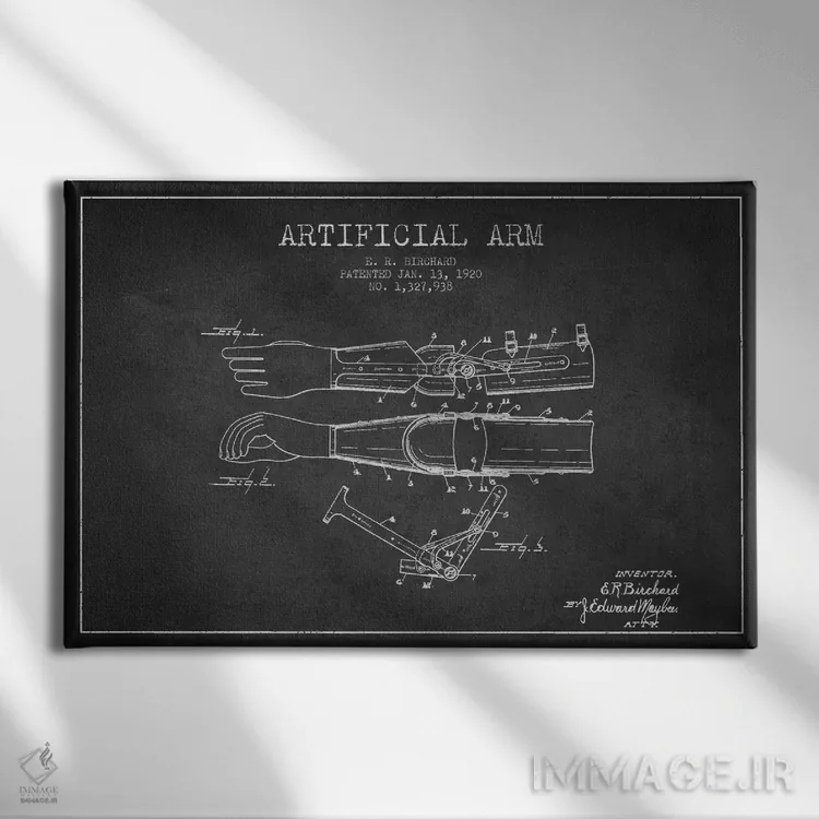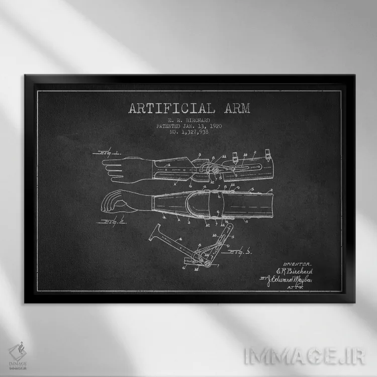 تابلو دکوراتیوِ «نقشهٔ ثبت اختراع دست مصنوعی (زغالی)»؛ مناسب برای فضاهایی با چوب تیره، چراغهای گرم و اکسسوریهای کلاسیک اثرِ «پیکسل کهنه (استودیو/نام هنری)».