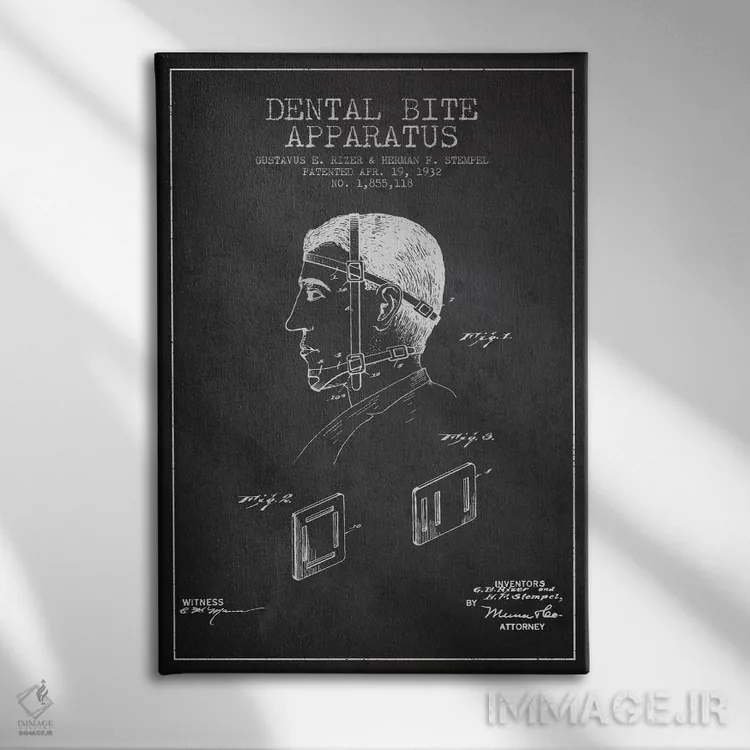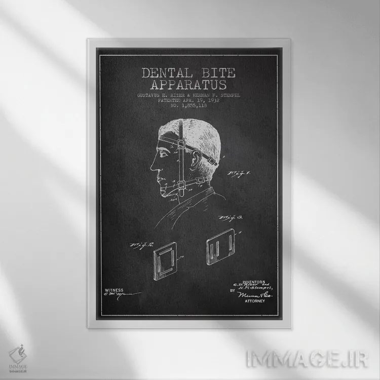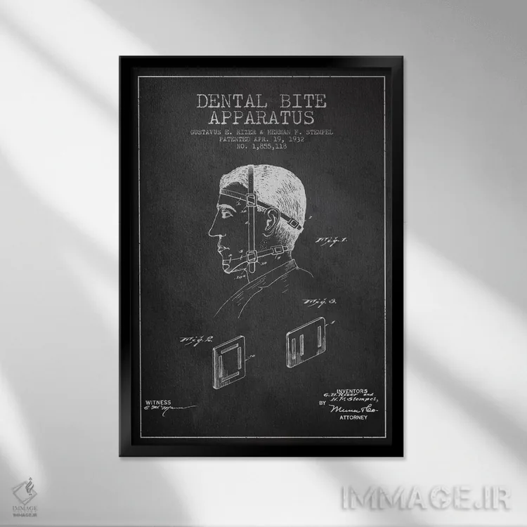 «نقشهٔ ثبت اختراع بایت دندان (زغالی)» اثرِ «پیکسل کهنه (استودیو/نام هنری)» اگر به جزئیات کلاسیک و حس قدیمیِ شیک علاقه دارید، گزینهی خوبیست.