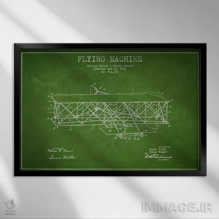 «نقشهٔ ثبت اختراع هواپیما (سبز)» اثرِ «پیکسل کهنه (استودیو/نام هنری)» برای راهرو، ورودی یا دیوارهای کوچک هم گزینهی خوبیست؛ چون حسش فوری منتقل میشود.